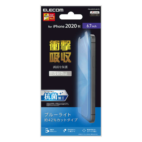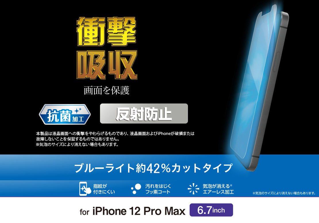 • マルチペット層が衝撃を吸収するiPhone 12 Pro Max用の衝撃吸収、ブルーライトカットタイプの反射防止フィルムです。
