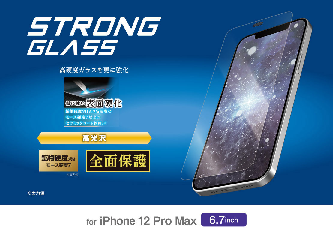 高硬度ガラスを更に強化。鉛筆硬度9Hより高硬度なモース硬度(鉱物硬度規格)7以上のセラミックコートにより傷に強い、iPhone 12 Pro Max用ガラスフィルムです。※当社液晶保護ガラスフィルム製品内の比較