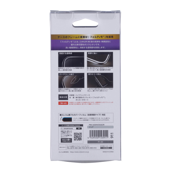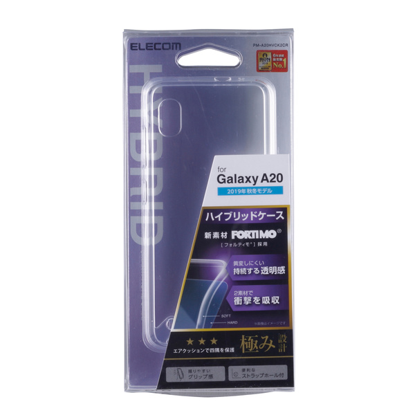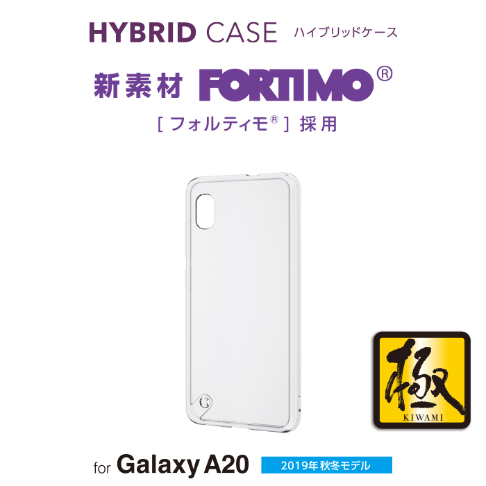 側面に高弾性・無黄変性に優れた三井化学(株)製「フォルティモ(R)/TPU(熱可塑性ポリウレタン)」素材を、背面に強靱で透明度の高いポリカーボネート素材を使用した、スリムなスタイルのGalaxy A20用ハイブリッドケースです。