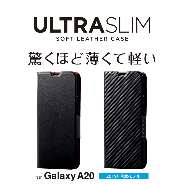 本体の薄さ、軽さを損ねない薄型・超軽量なウルトラスリムタイプのGalaxy A20用ソフトレザーケース(手帳型)です。