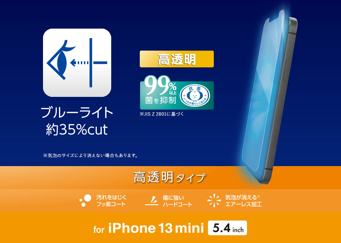 • iPhone 13 miniの液晶画面をキズや汚れから守る、指紋防止、ブルーライトカット、高透明タイプの液晶保護フィルムです。