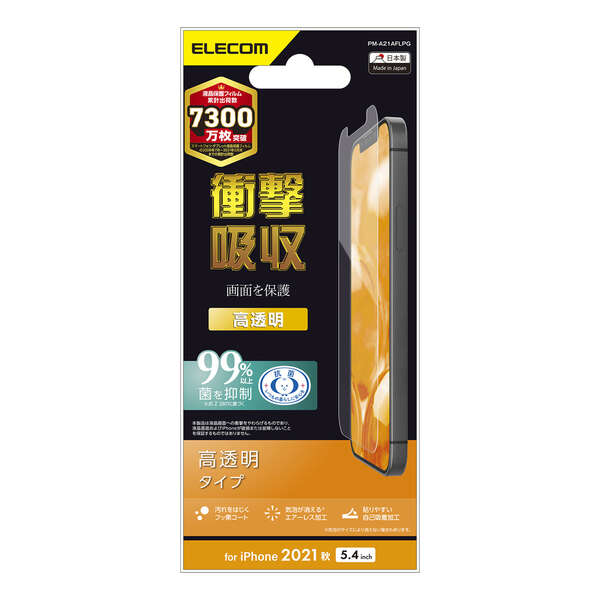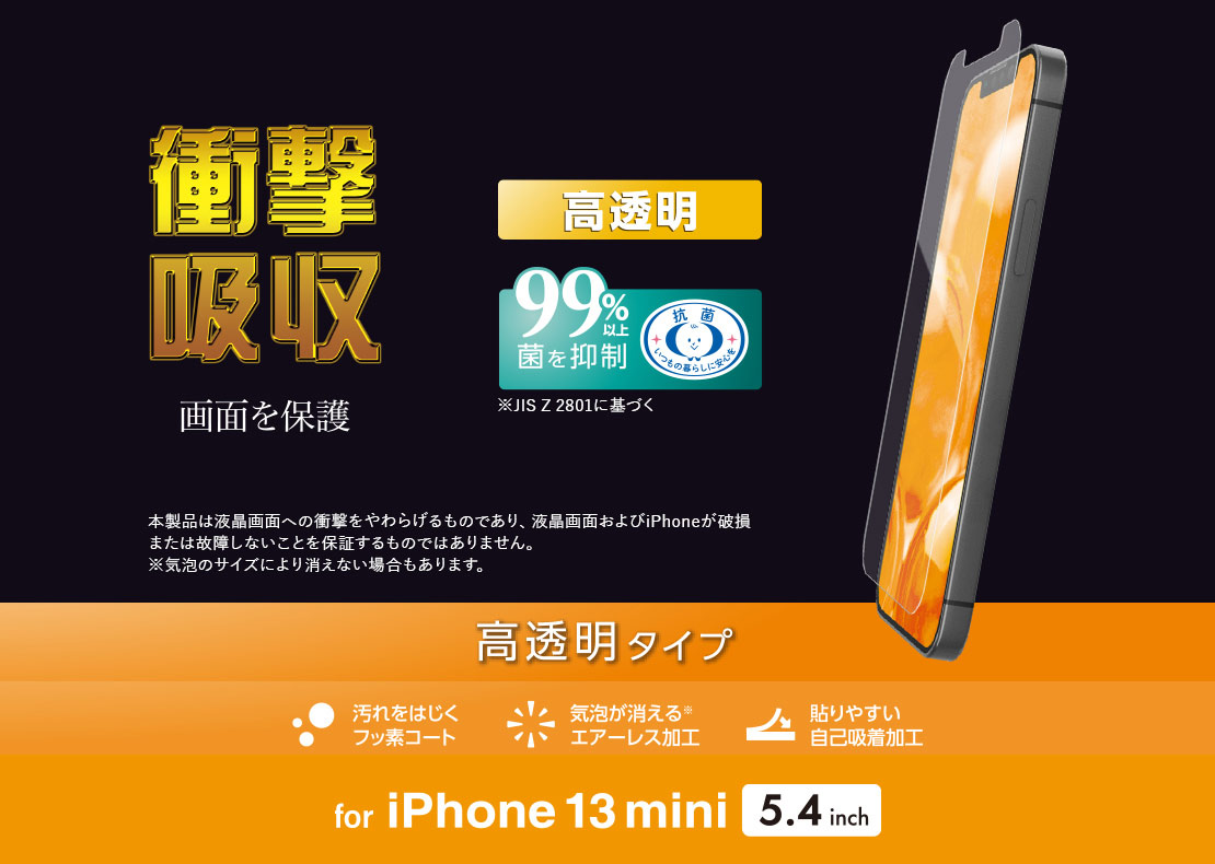 • 特殊構造のフィルムが衝撃を緩和し液晶画面を保護する、高透明タイプのiPhone 13 mini用衝撃吸収フィルムです。