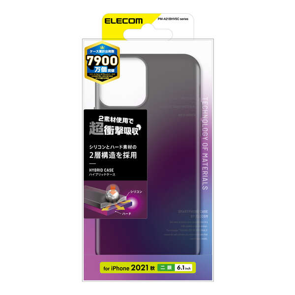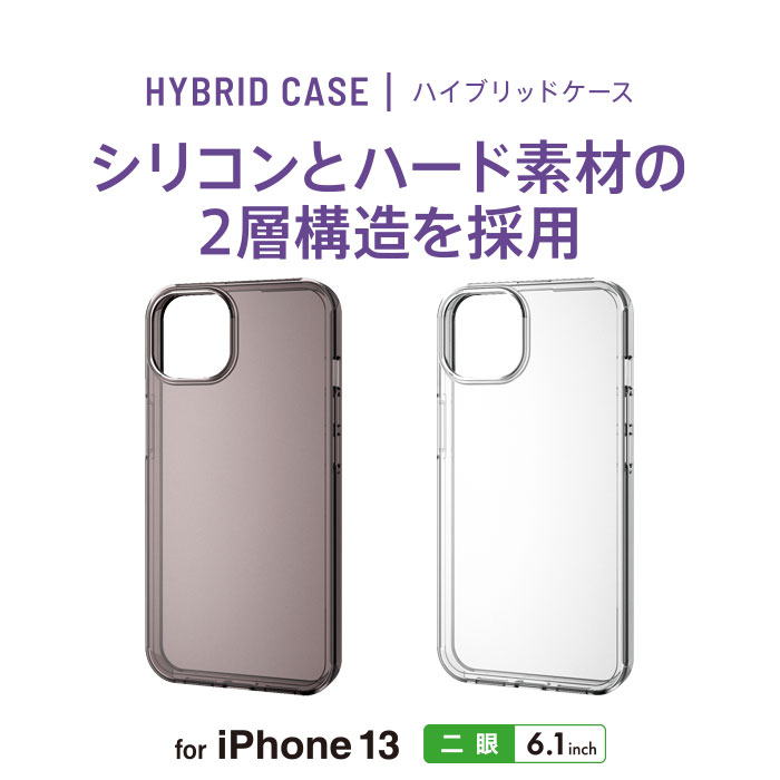 クッション性の高いシリコン素材と、強じんなポリカーボネート製のハード素材のハイブリッド構造で、耐衝撃性の高いiPhone 13用ハイブリッドケースです。