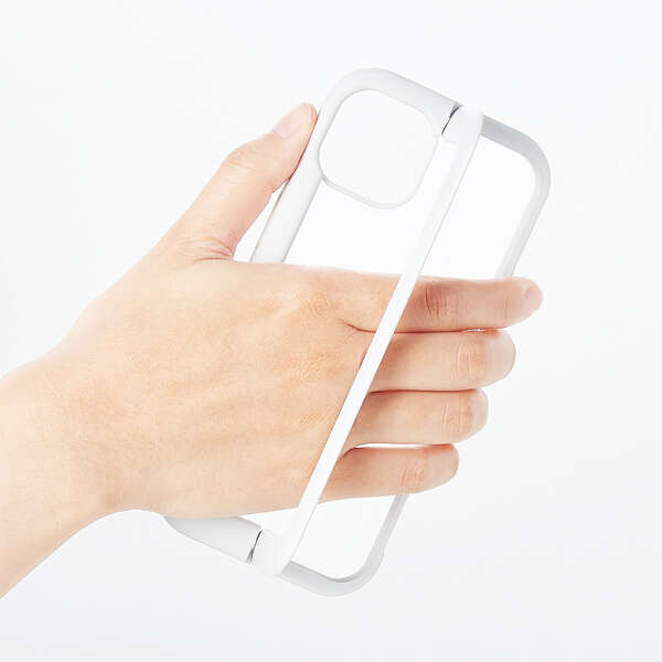 端末のデザインを損ねない背面クリアのケースに落下防止機能を兼ねたスタンドの付いた、手に持って安心・机に置いて快適なiPhone 13用ハイブリッドケース スタンド機能付きです。
