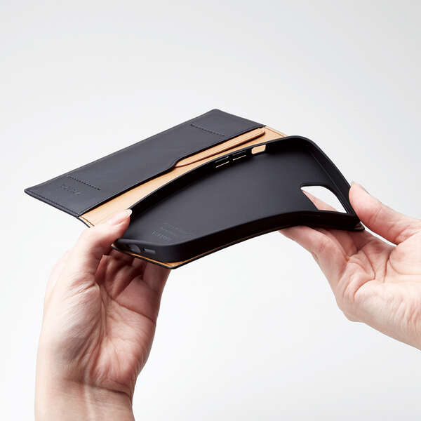 ジャケットに美しく収まるよう、スマートにデザインされたソフトレザーケース(手帳型)