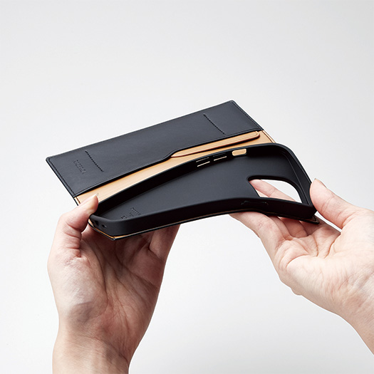 ジャケットに美しく収まるよう、スマートにデザインされたソフトレザーケース(手帳型)