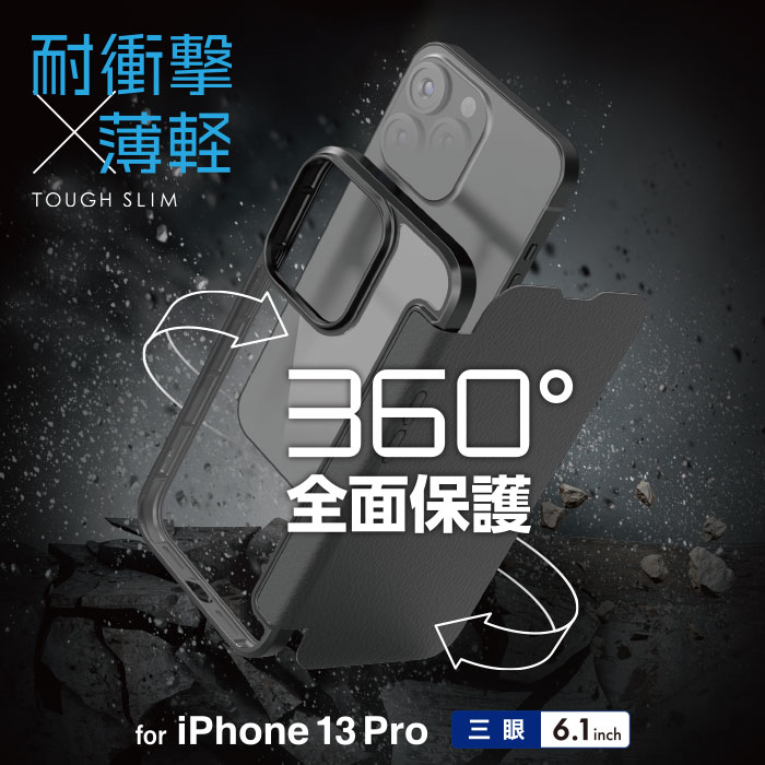 全周に配置された衝撃を吸収するエアクッションと背面には傷に強く割れにくい特殊樹脂を採用し、液晶画面フラップで端末を360度全面保護する、iPhone 13 Pro用TOUGH SLIMケースです。