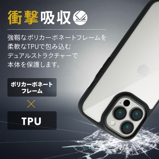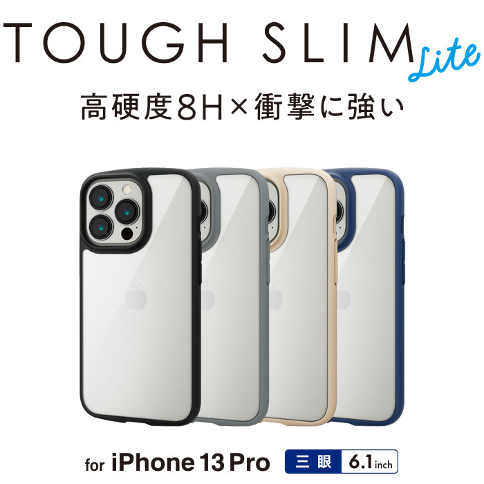 全周に配置した独自設計のエアクッションが衝撃を吸収し、背面には高硬度8Hの特殊樹脂を採用した、iPhone 13 Pro用TOUGH SLIM LITEケースです。