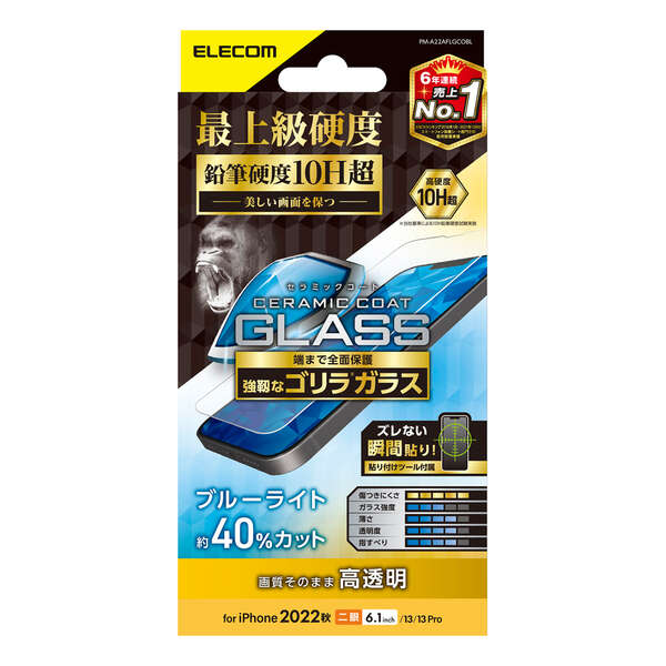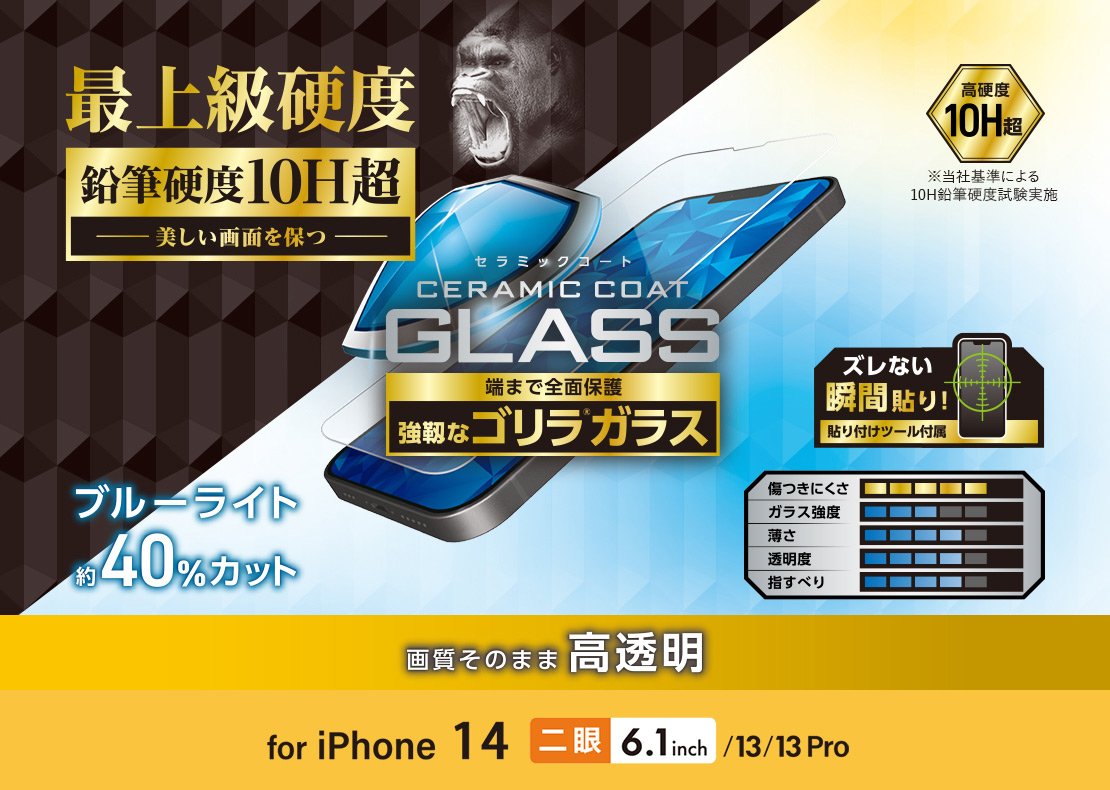 高硬度ガラスを更に強化。鉛筆硬度10H以上のセラミックコートにより傷に強い、Gorilla(R)ガラスを採用した薄型・ブルーライトカットタイプのiPhone 14、iPhone 13、iPhone 13 Pro用ガラスフィルムです。 ※当社液晶保護ガラスフィルム製品内の比較