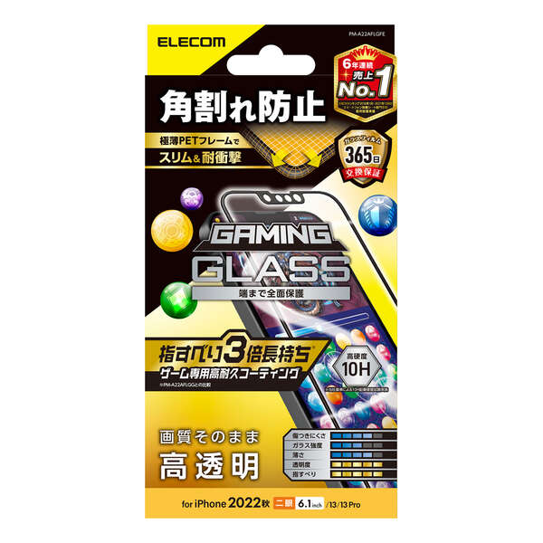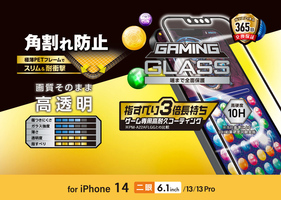 ゲーム操作に最適な長持ちコーティング!ガラス特有のなめらかな指滑りを実現し、3D設計のPETフレームで角割れを防ぐiPhone 14、iPhone 13、iPhone 13 Pro用液晶保護ガラスです。