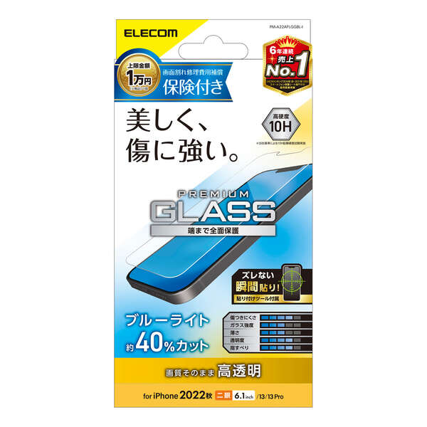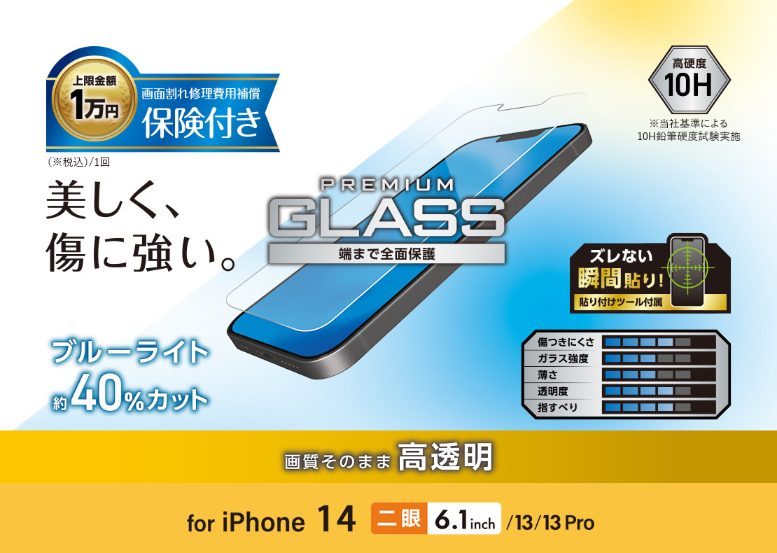 液晶パネルが破損しても安心。1年以内(※免責期間30日含む)最大1万円の端末修理代金を補償するブルーライトカットタイプのiPhone 14、iPhone 13、iPhone 13 Pro用液晶保護ガラスです。