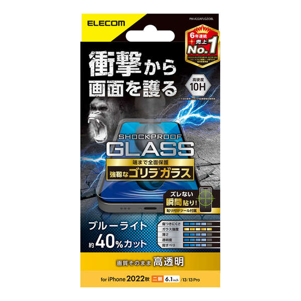 • 特殊な衝撃吸収層を採用し、衝撃から画面を守る。Gorilla(R)ガラスを採用した薄型・ブルーライトカットタイプのiPhone 14、iPhone 13、iPhone 13 Pro用液晶保護ガラスです。