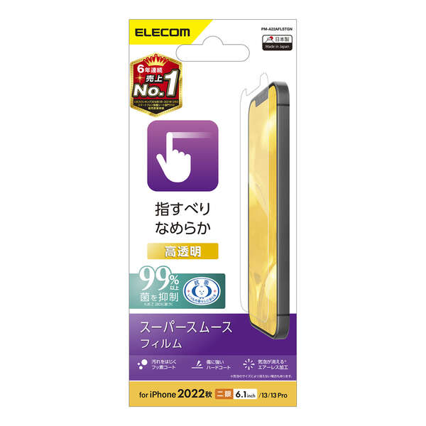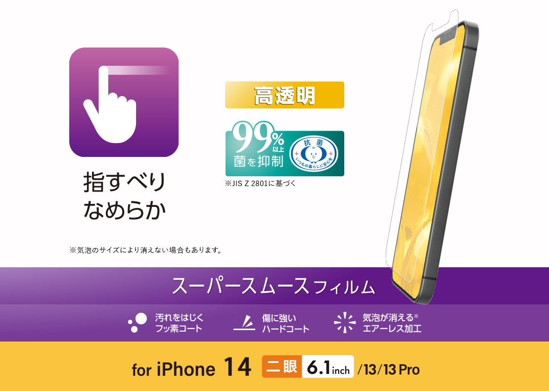 iPhone 14、iPhone 13、iPhone 13 Proの液晶画面を傷や汚れから守る、指紋防止、スムース、高透明タイプの液晶保護フィルムです。