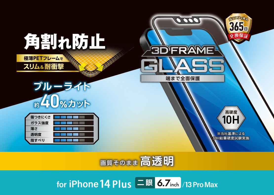 • 3D設計のPETフレームで角割れを防ぐブルーライトカットタイプのiPhone 14 Plus、iPhone 13 Pro Max用フレーム付き液晶保護ガラスです。