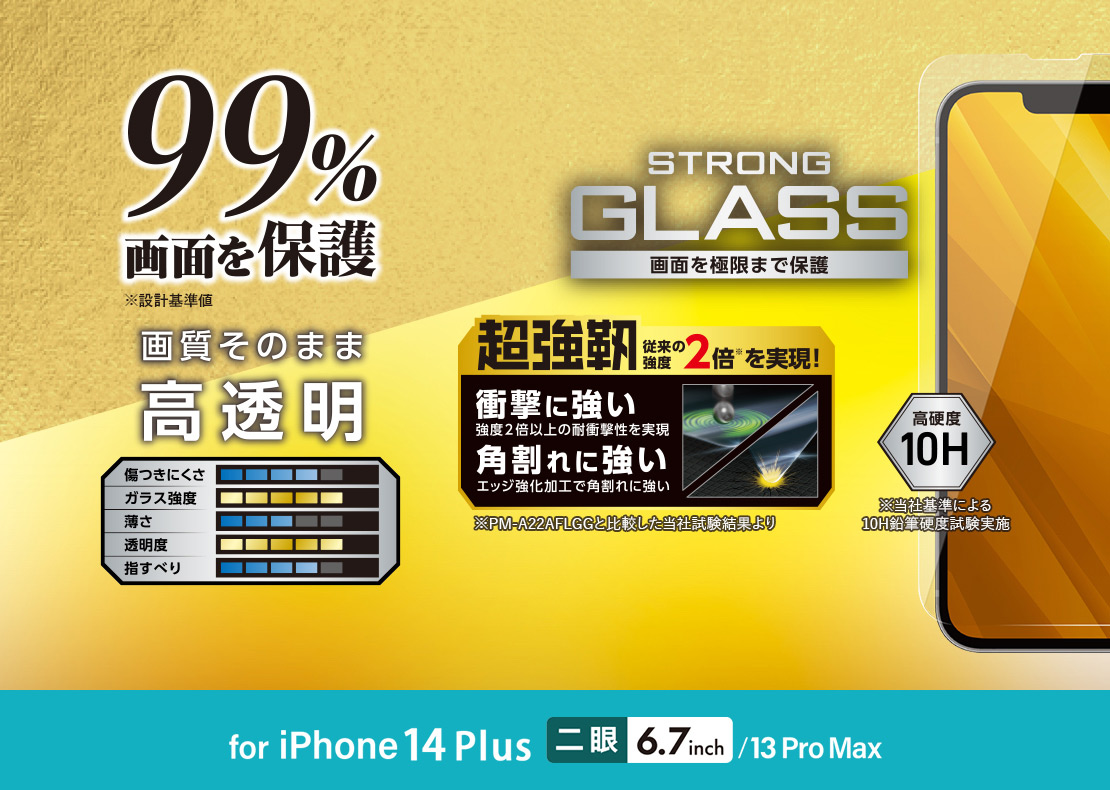 • 液晶画面カバー率99%。超極み設計を採用し、高硬度ガラスを更に強化したiPhone 14 Plus、iPhone 13 Pro Max用液晶保護ガラスです。※当社PM-A22BFLGGとの比較