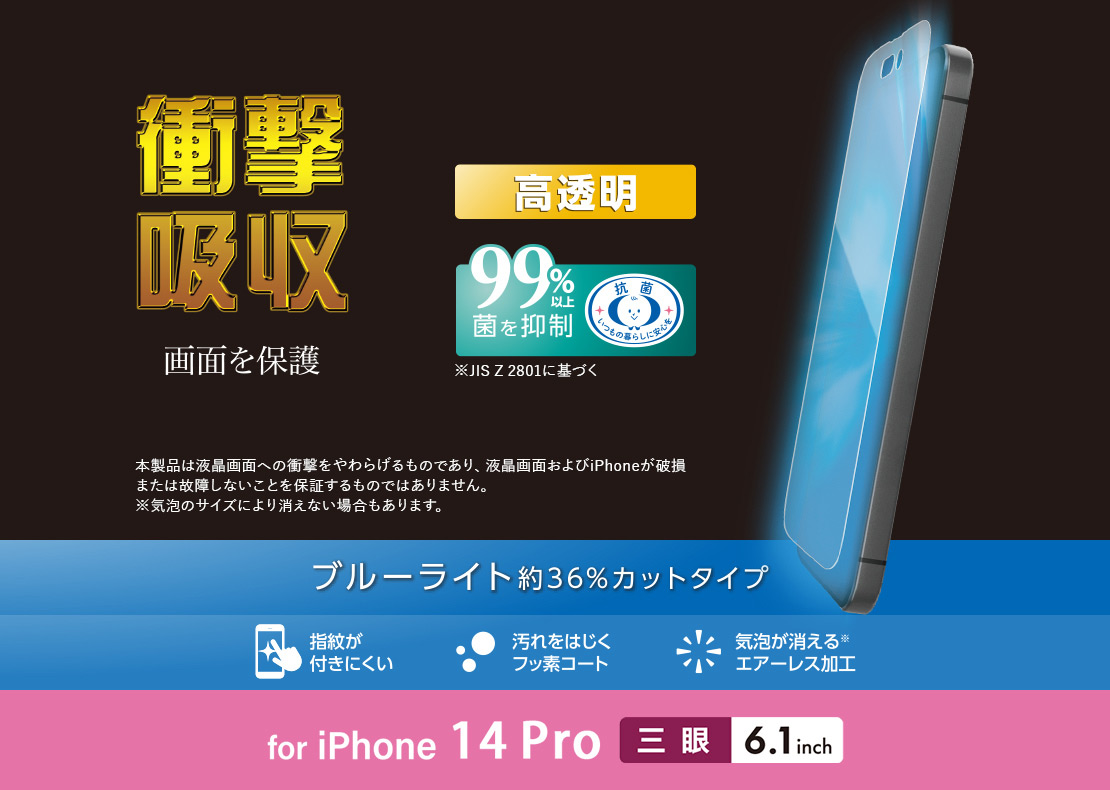 • 特殊構造のフィルムが衝撃を緩和し液晶画面を保護する、ブルーライトカット、高透明タイプのiPhone 14 Pro用衝撃吸収フィルムです。