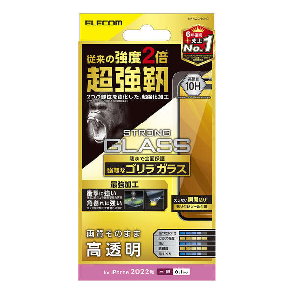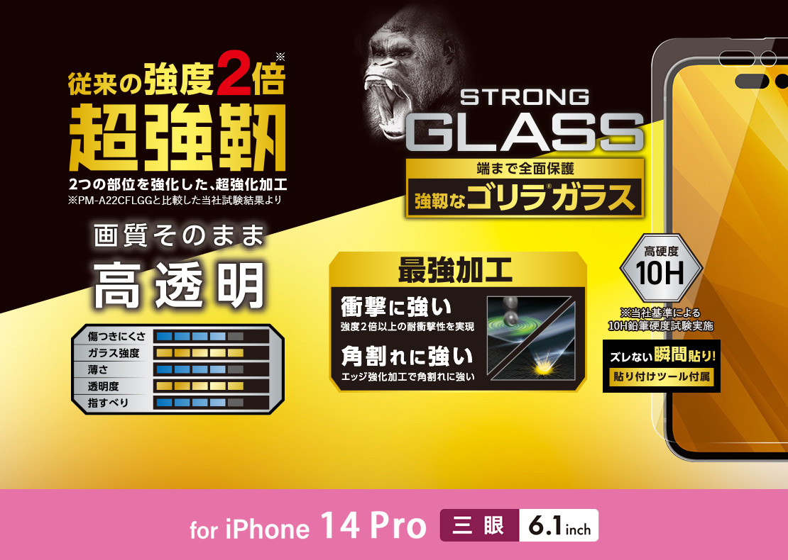 • 高硬度ガラスを更に強化。エッジ強化加工でガラスフィルムが欠けにくく、長期間の使用にも耐える強さを持つGorilla(R)ガラスを採用したiPhone 14 Pro用液晶保護ガラスです。 ※当社PM-A22CFLGGとの比較