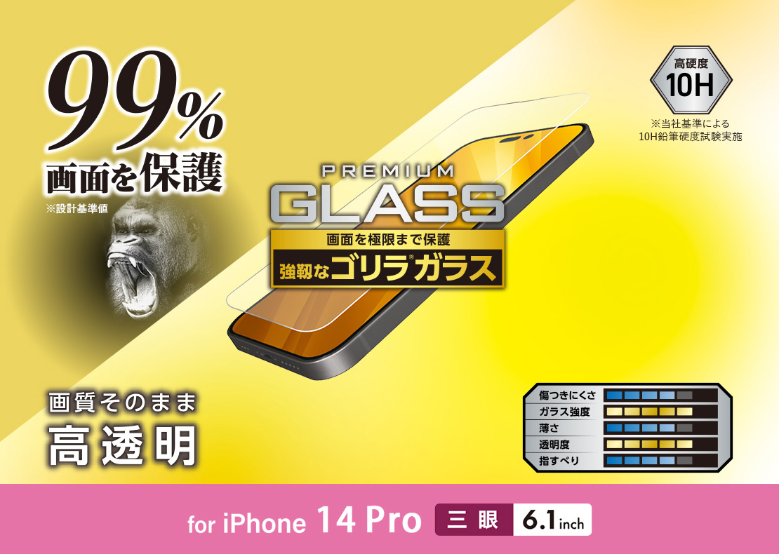 • 液晶画面カバー率99%。超極み設計でGorilla(R)ガラスを採用した薄型タイプのiPhone 14 Pro用液晶保護ガラスです。