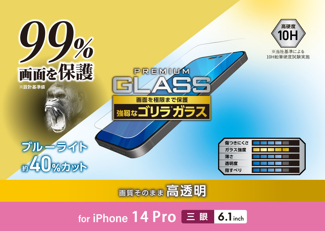 液晶画面カバー率99%。超極み設計でGorilla(R)ガラスを採用した薄型・ブルーライトカットタイプのiPhone 14 Pro用液晶保護ガラスです。