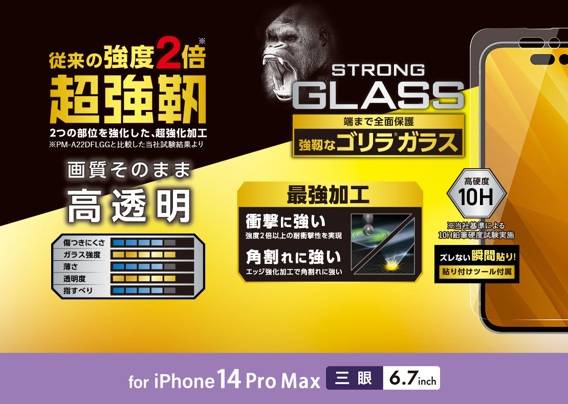耐衝撃性とエッジ強化、2つの部位を強化加工することで従来のガラスフィルムの強度2倍を実現。