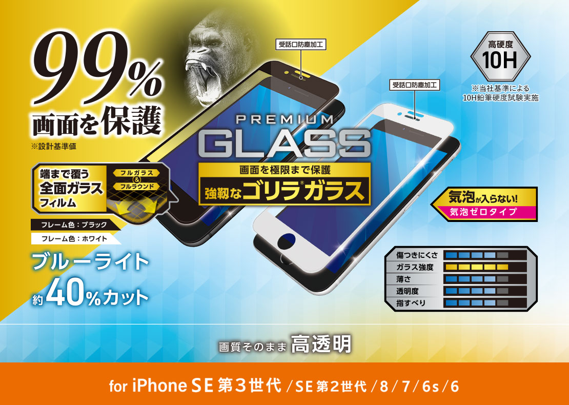 液晶画面カバー率99%。超極み設計でGorilla(R)ガラスを採用した薄型・ブルーライトカットタイプのiPhone SE 第3世代、iPhone SE 第2世代、iPhone 8、iPhone 7、iPhone 6s、iPhone 6用液晶保護ガラスです。