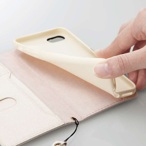 ずっと好きでいられる、ベーシックな可愛さ。フィンガーストラップ付きiPhone SE 第2世代、iPhone 8、iPhone 7用ソフトレザーケース(手帳型)です。