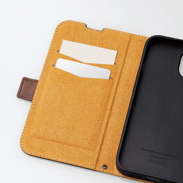 フラップの内側に、メモやカードなどが収納できるカードポケットが2つ付いています。カードを出し入れすることなく、そのままICカードを使用可能です。