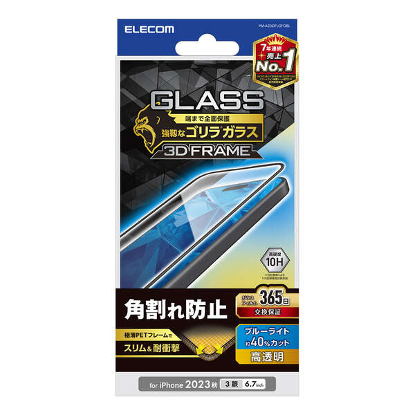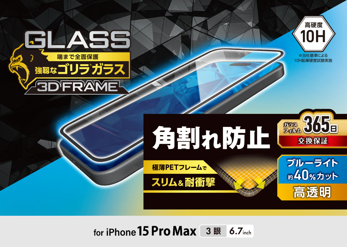 iPhone 15 Pro Max ガラスフィルム フレーム付き ゴリラ 0.21mm 高透明 BLカット