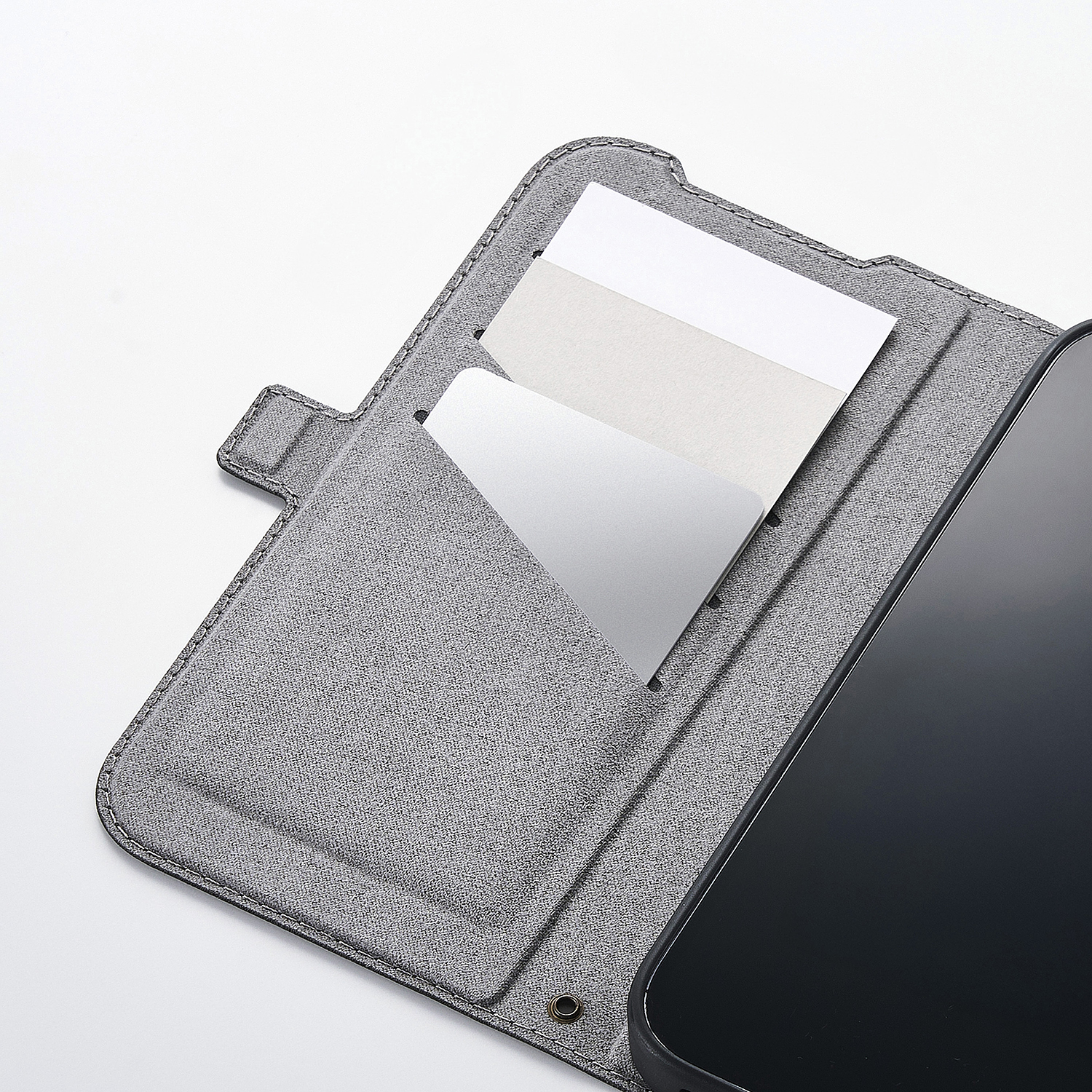 フラップの内側に、メモやカードなどが収納できるポケットが3つ付いています。カードを出し入れすることなく、そのままICカードを使用可能です。