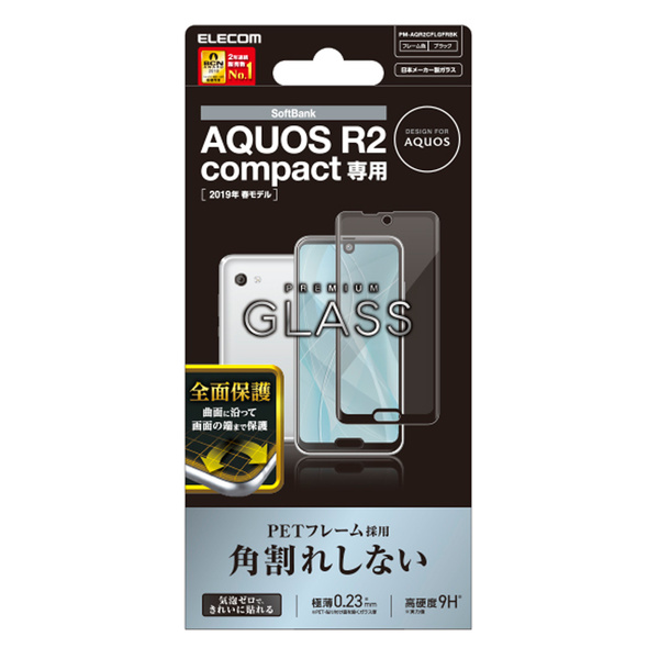 角割れしないフレーム付き。 美しいガラスで画面の端まで保護するフルカバータイプのAQUOS R2 compact用ガラスフィルムです。