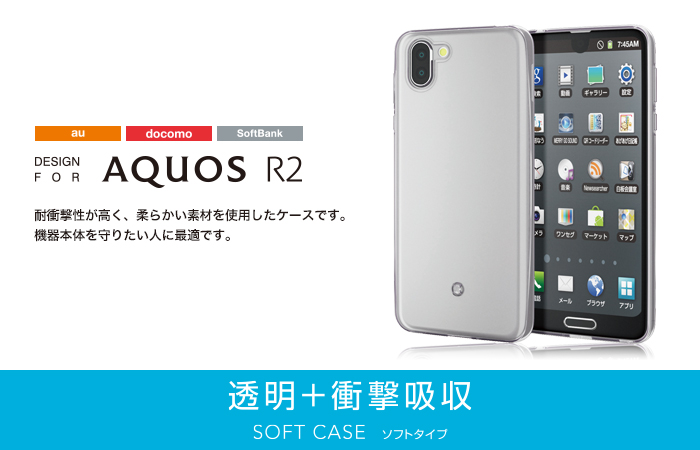強じんな耐久性としなやかな弾力性を合わせ持ったTPU(熱可塑性ポリウレタン)素材を使用した、本体デザインが美しく際立つスーパークリスタルクリアのAQUOS R2用ソフトケースです。