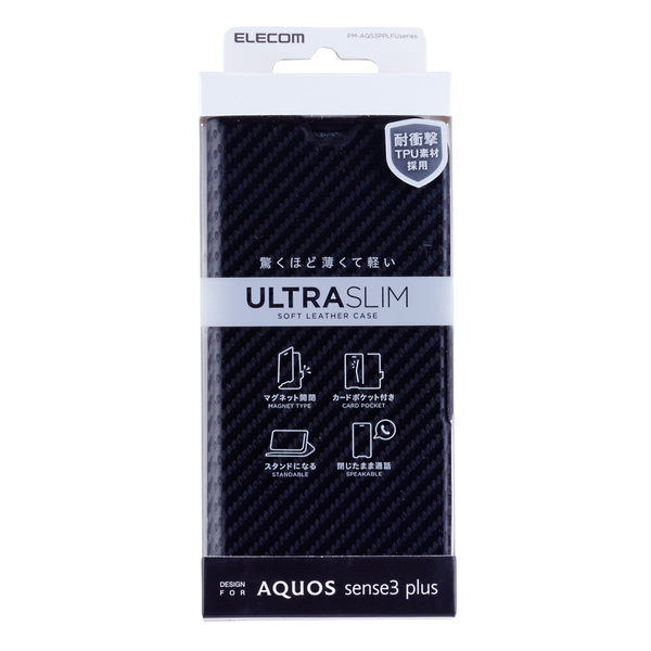 本体の薄さ、軽さを損ねない薄型・超軽量なウルトラスリムタイプのAQUOS sense3 plus用ソフトレザーケース(手帳型)です。