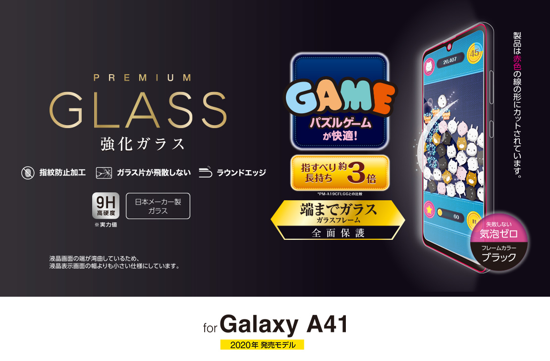 • 指すべりが約3倍長持ちの特殊加工で、快適なゲーム操作が持続するGalaxy A41用ガラスフィルムです。※PM-A19CFLGGとの比較