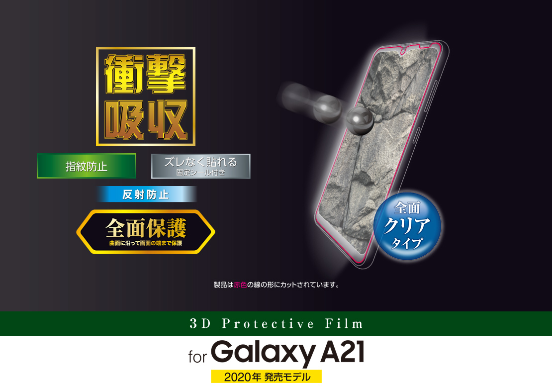 • 端末のガラス面と同じラウンド形状を再現した3D設計で、画面の端まで保護するGalaxy A21、Galaxy A21 シンプル用フルカバーフィルムです。