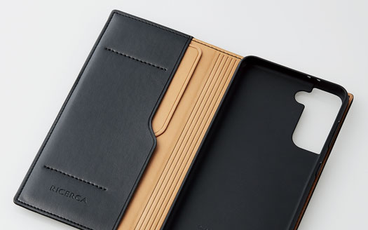 ジャケットに美しく収まるよう、スマートにデザインされたGalaxy S21 5G用ソフトレザーケース(手帳型)です。