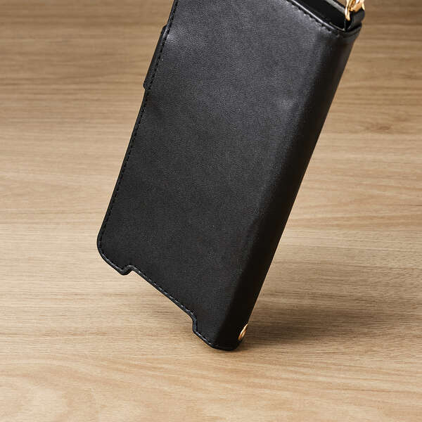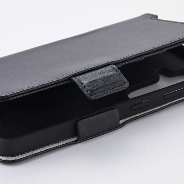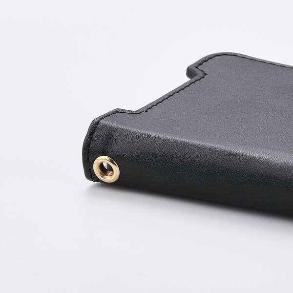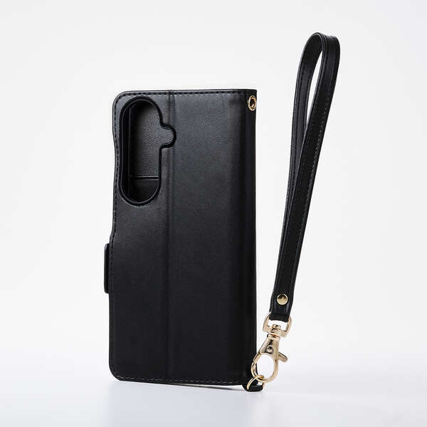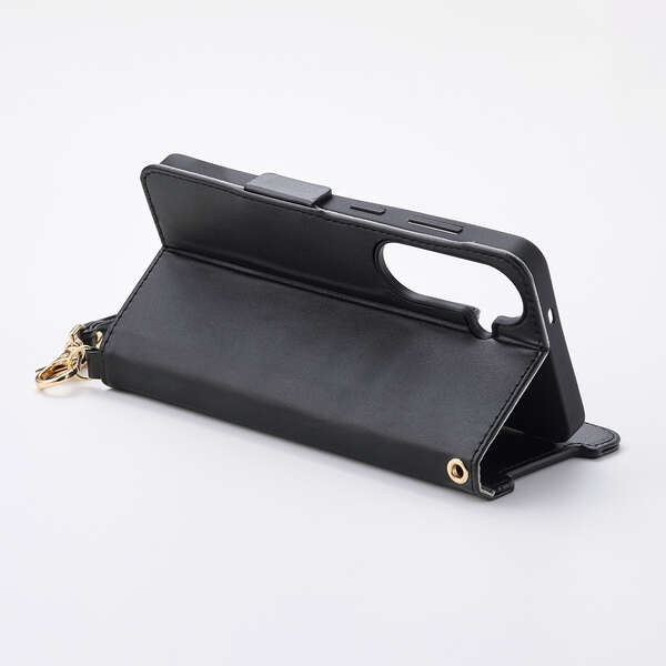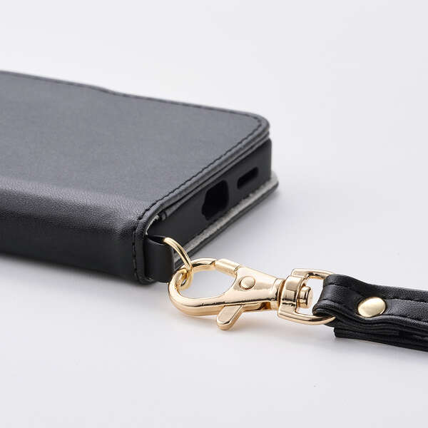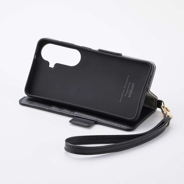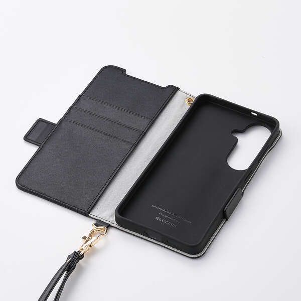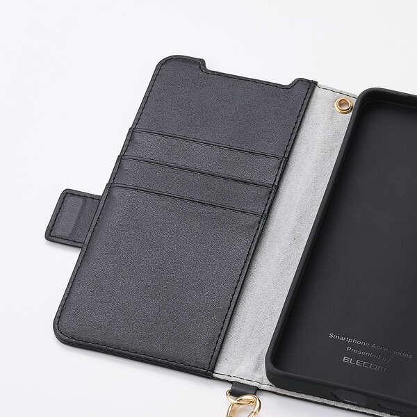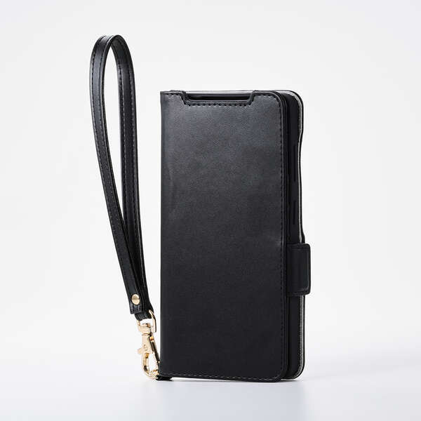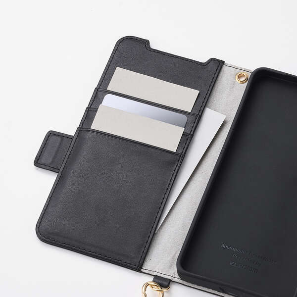 4つのカードポケットを備えた、ハンドストラップ付きの手帳型ケースです。