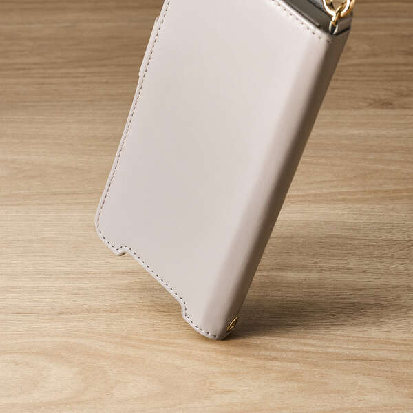 4つのカードポケットを備えた、ハンドストラップ付きの手帳型ケースです。