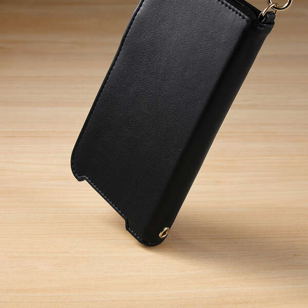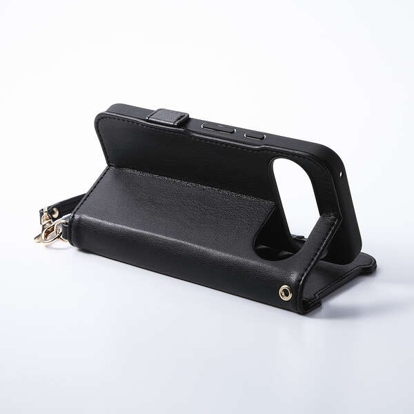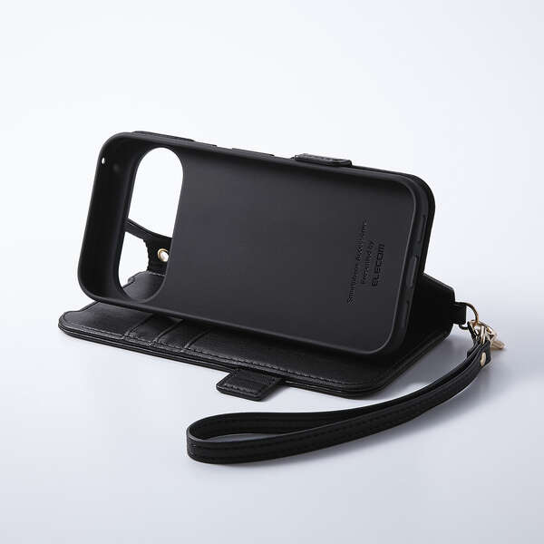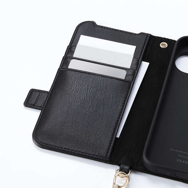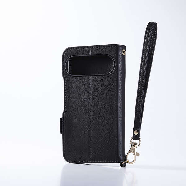 4つのカードポケットを備えた、ハンドストラップ付きの手帳型ケースです。