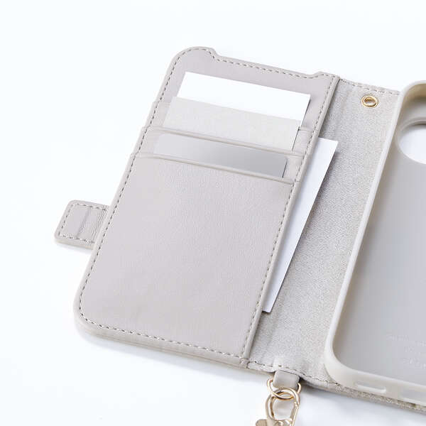 4つのカードポケットを備えた、ハンドストラップ付きの手帳型ケースです。