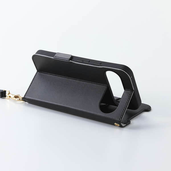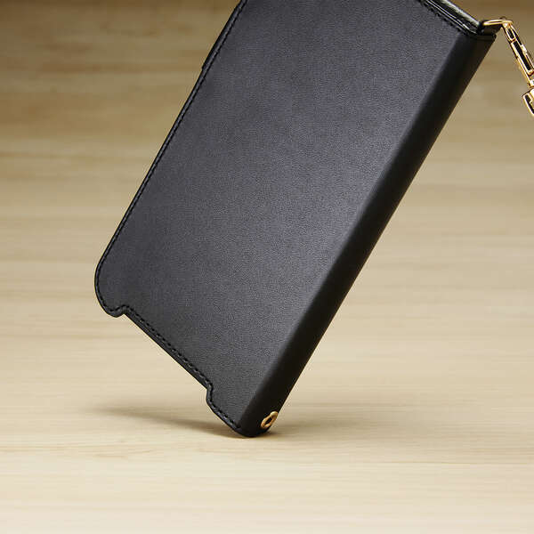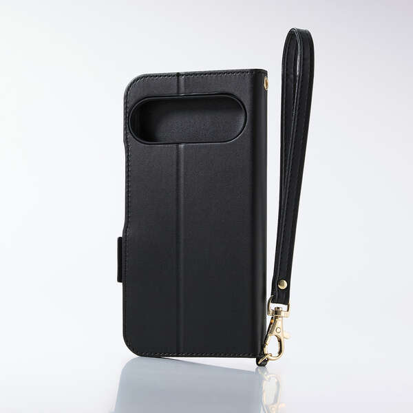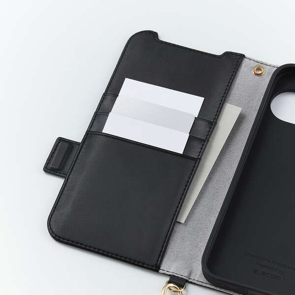 4つのカードポケットを備えた、ハンドストラップ付きの手帳型ケースです。