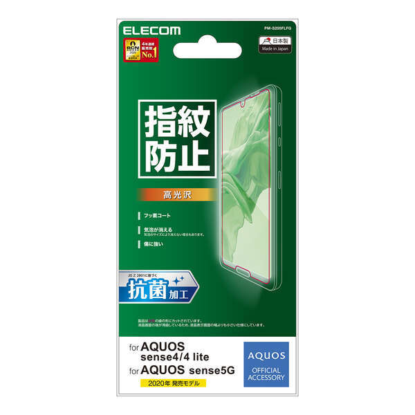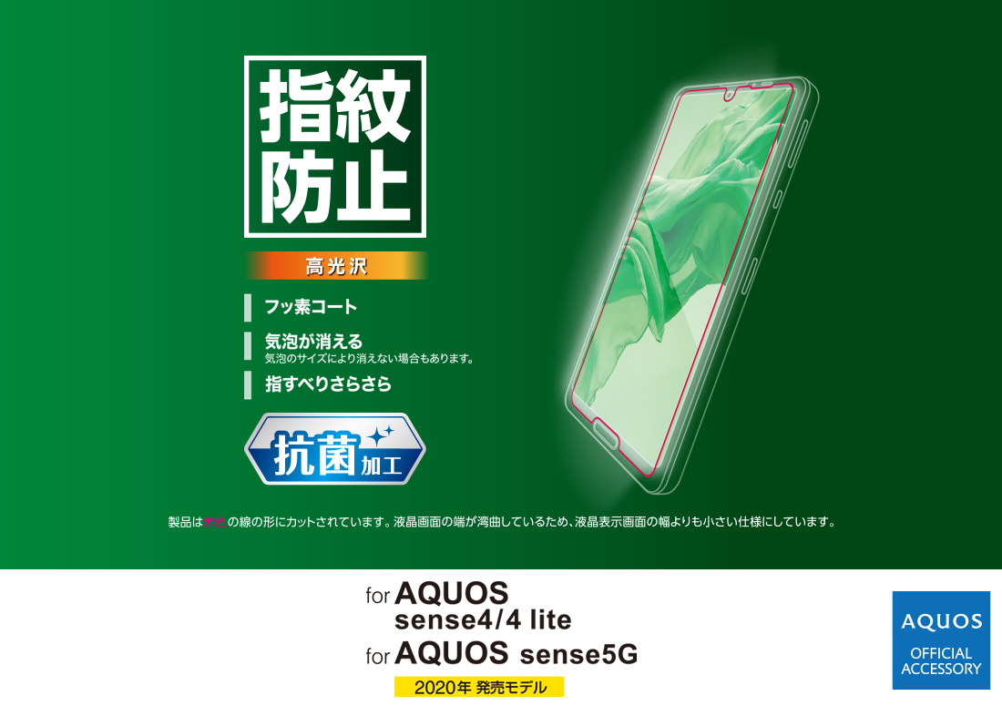 AQUOS sense4、AQUOS sense4 lite、AQUOS sense5Gの液晶画面をキズや汚れから守る、指紋防止タイプの高光沢フィルムです。