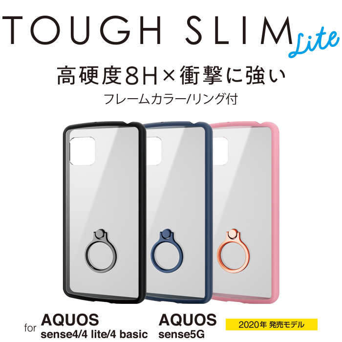 全周に配置した独自設計のエアクッションが衝撃を吸収し、背面には高硬度8Hの特殊樹脂を採用した落下防止リング付きのAQUOS sense4、AQUOS sense4 lite、AQUOS sense4 basic、AQUOS sense5G用TOUGH SLIM LITEケースです。