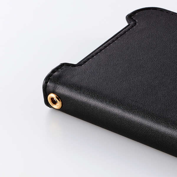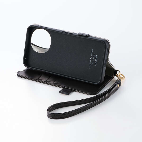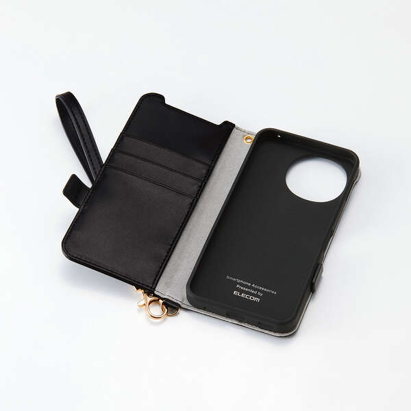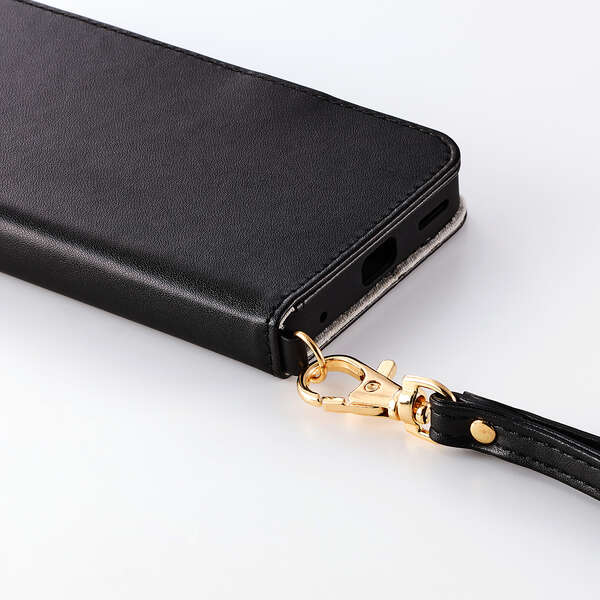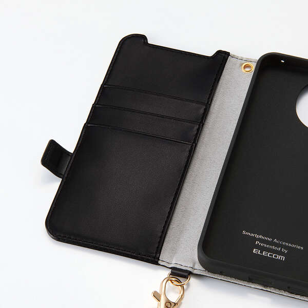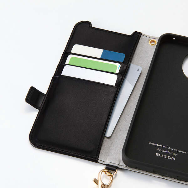 4つのカードポケットを備えた、ハンドストラップ付きの手帳型ケースです。