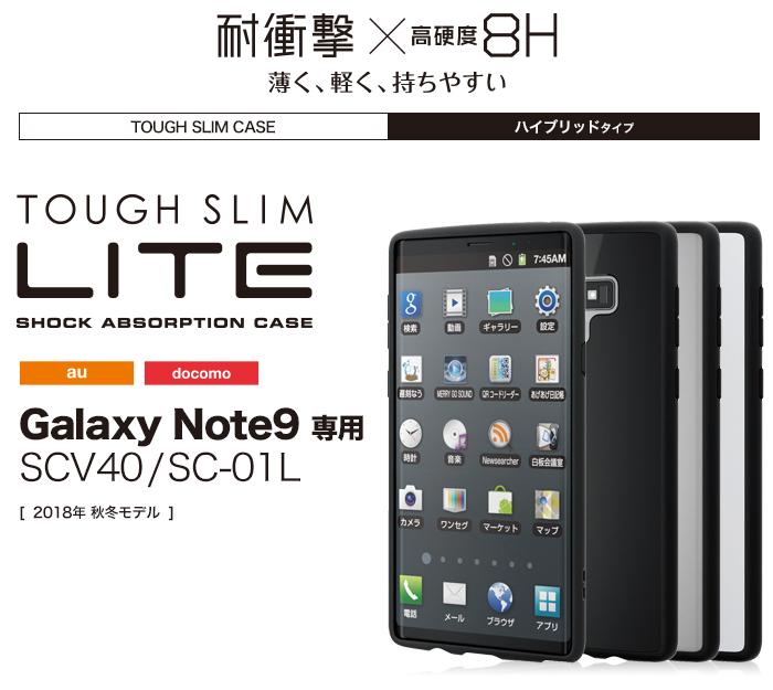 側面に弾力性のあるTPU素材を、背面に高硬度8Hのポリカーボネート素材を使用した、Galaxy Note9用TOUGH SLIM LITEケースです。