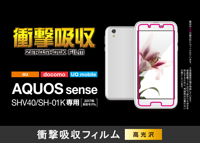 特厚シリコン層が衝撃を吸収し液晶画面を保護する、指紋防止・高光沢タイプのAQUOS sense用衝撃吸収フィルムです。