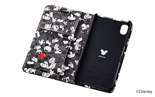 ケース表面にはさりげなくアンティーク調のディズニーキャラクタープレートが、内側にはミッキーマウスやミニーマウスが登場するカジュアルなテキスタイルデザインです。
