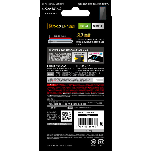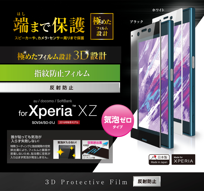 - ラウンド部分にも特殊粘着層を採用し、液晶画面を端まで保護。気泡がぬけてきれいに貼れるXperia (TM) XZ用反射防止タイプの液晶保護フィルムです。