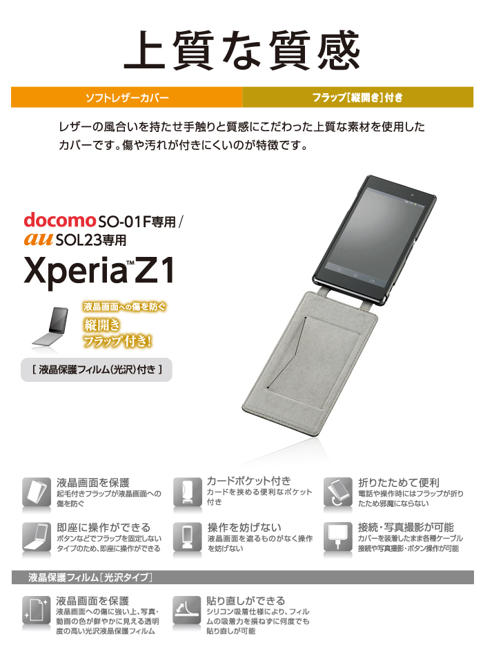 高級感あるソフトレザー素材を使用しながら、スリムなスタイルを実現したau/docomo Xperia(TM) Z1(SOL23/SO-01F)用ソフトレザーカバーです。