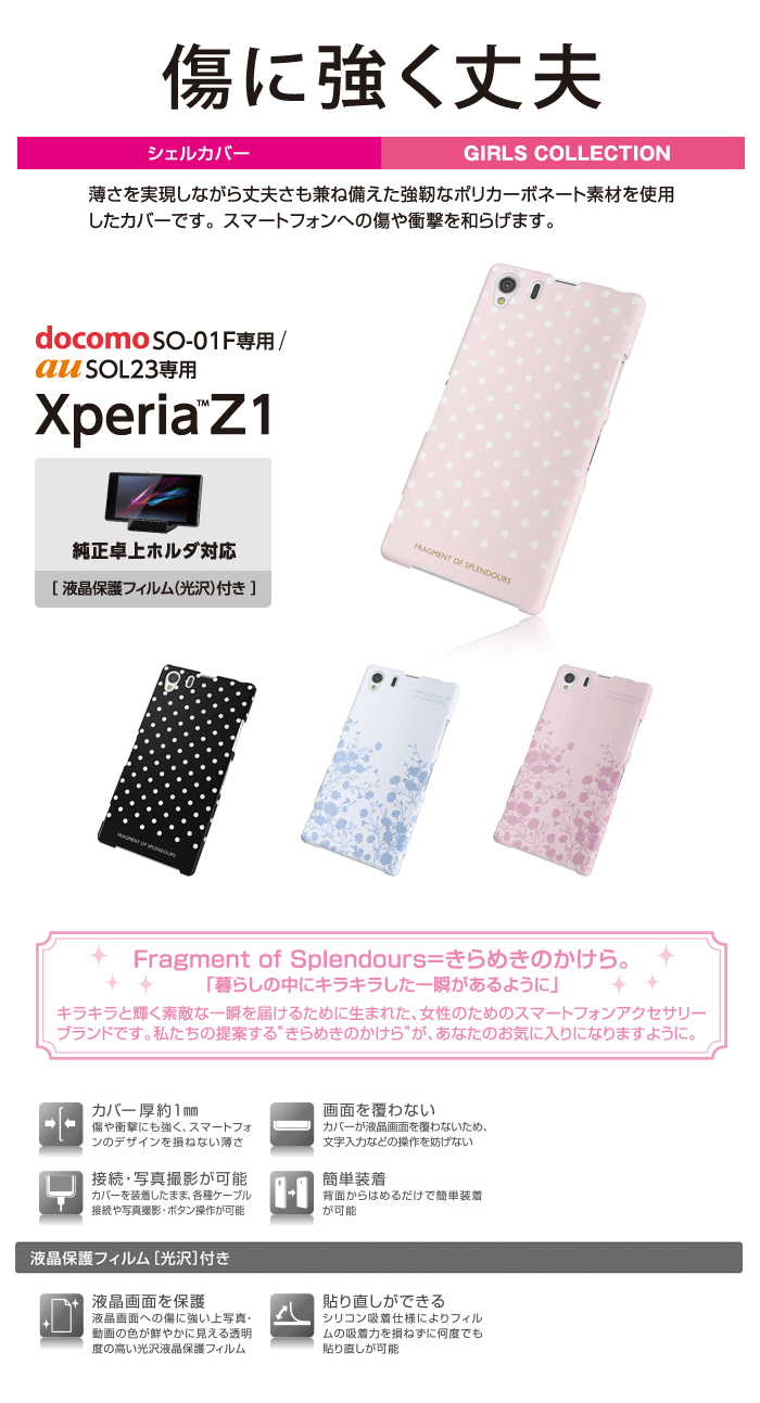 華やかなデザインでスマートフォンをドレスアップ!au/docomo Xperia(TM) Z1(SOL23/SO-01F)を美しく彩る、液晶保護フィルム付きシェルカバー“Fragment of SPLENDOURS”。