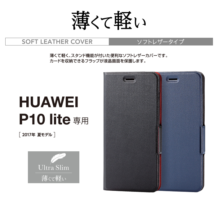本体の薄さ、軽さを損ねない薄型・超軽量なウルトラスリムタイプのP10 lite用ソフトレザーカバー(手帳型)です。
